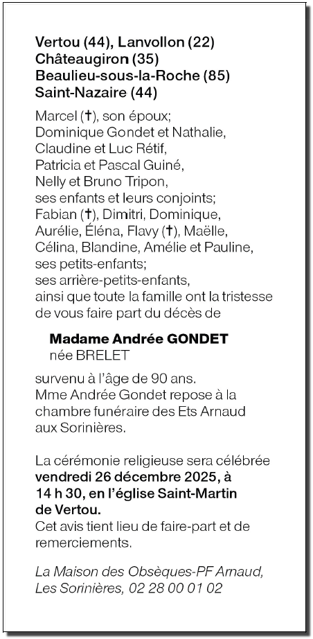 Cet espace « condoléances » est dédié à la mémoire de Madame Andrée GONDET née BRELET.
