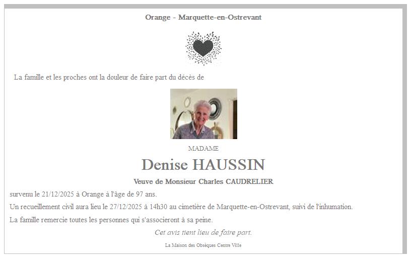 Cet espace « condoléances » est dédié à la mémoire de Madame Denise CAUDRELIER née HAUSSIN.