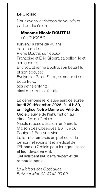 Cet espace « condoléances » est dédié à la mémoire de Madame Nicole BOUTRU née DUCARD.