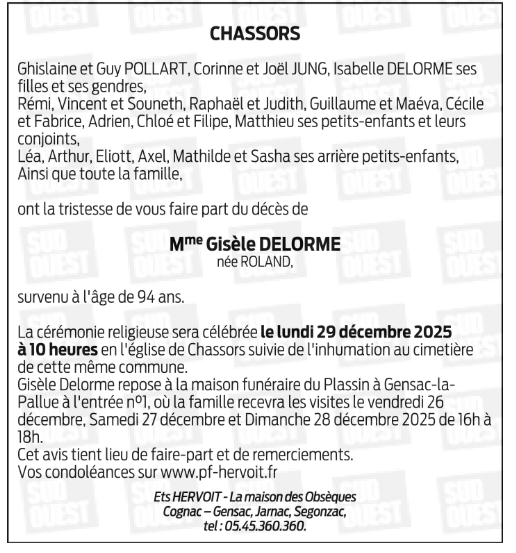 Cet espace « condoléances » est dédié à la mémoire de Madame Gisèle DELORME née ROLAND.
