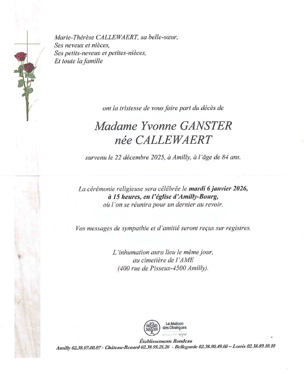 Cet espace « condoléances » est dédié à la mémoire de Madame Yvonne GANSTER née CALLEWAERT.