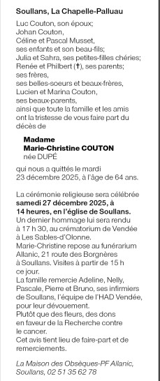 Cet espace « condoléances » est dédié à la mémoire de Madame Marie-Christine COUTON née DUPÉ.