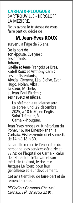 Décédé à Carhaix-Plouguer (29270) le lundi 22 décembre 2025