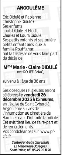 Cet espace « condoléances » est dédié à la mémoire de Madame Marie Claire DIDULÉ ROUFFIGNAC.