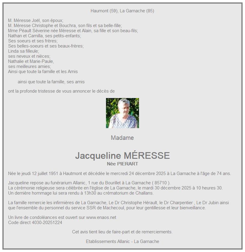 Cet espace « condoléances » est dédié à la mémoire de Madame Jacqueline MÉRESSE née PIERART.