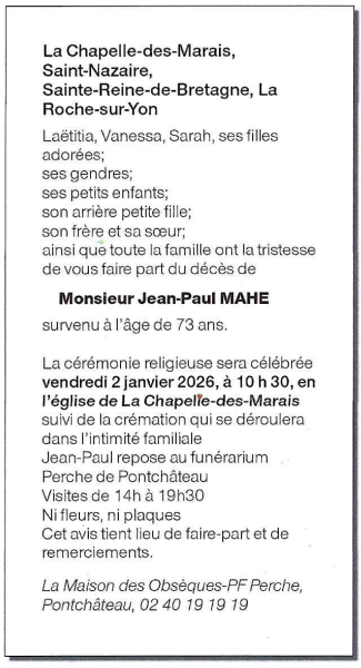 Cet espace « condoléances » est dédié à la mémoire de Monsieur Jean-Paul MAHE.