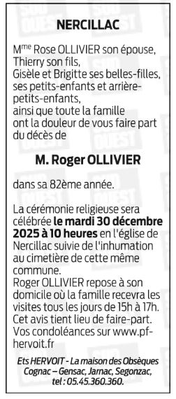 Décédé à Nercillac (16200) le jeudi 25 décembre 2025