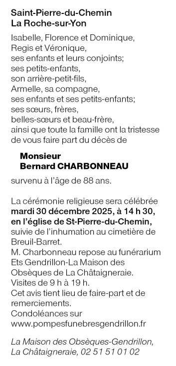 Cet espace « condoléances » est dédié à la mémoire de Monsieur Bernard CHARBONNEAU.
