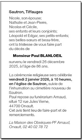 Cet espace « condoléances » est dédié à la mémoire de Monsieur Paul BLANLOEIL.
