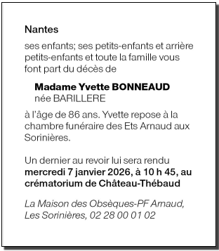 Cet espace « condoléances » est dédié à la mémoire de Madame Yvette BONNEAUD née BARILLERE.