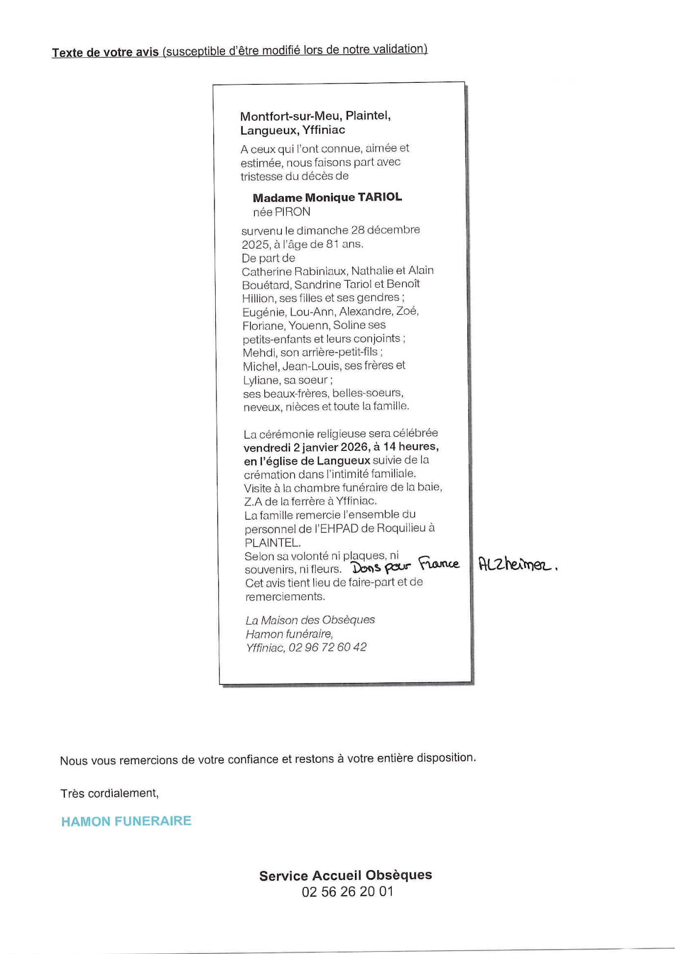 de Madame Monique TARIOL née PIRON