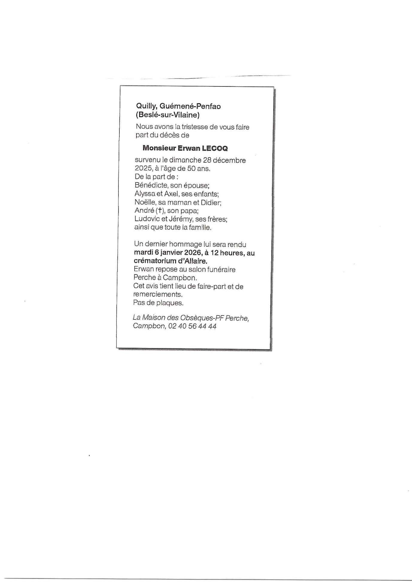 Cet espace « condoléances » est dédié à la mémoire de Monsieur ERWAN LECOQ.