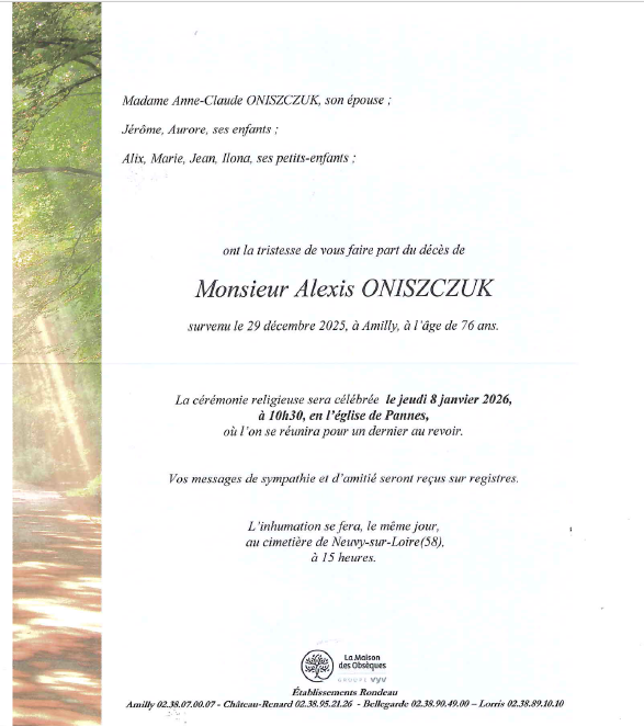 Cet espace « condoléances » est dédié à la mémoire de Monsieur Alexis ONISZCZUK.