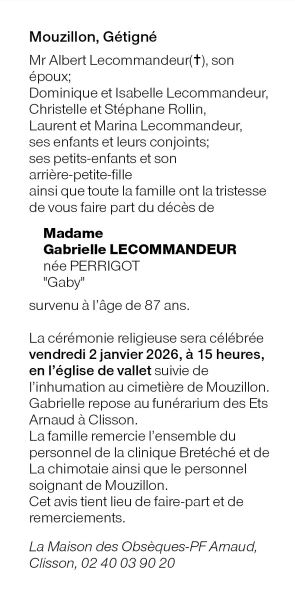 Décédée à Cugand (85610) le lundi 29 décembre 2025
