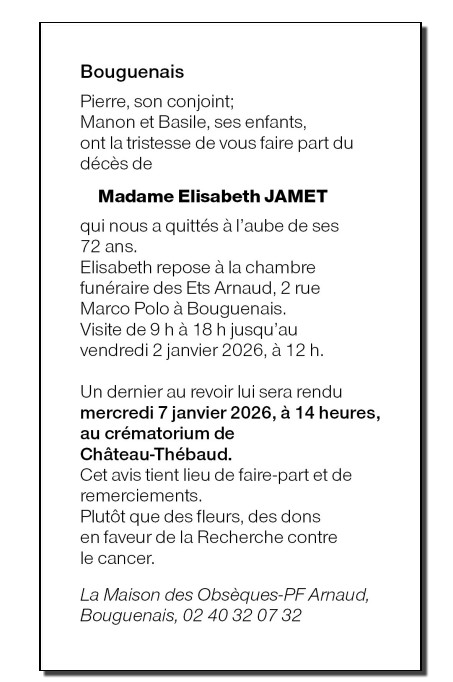 Cet espace « condoléances » est dédié à la mémoire de Madame Elisabeth JAMET.
