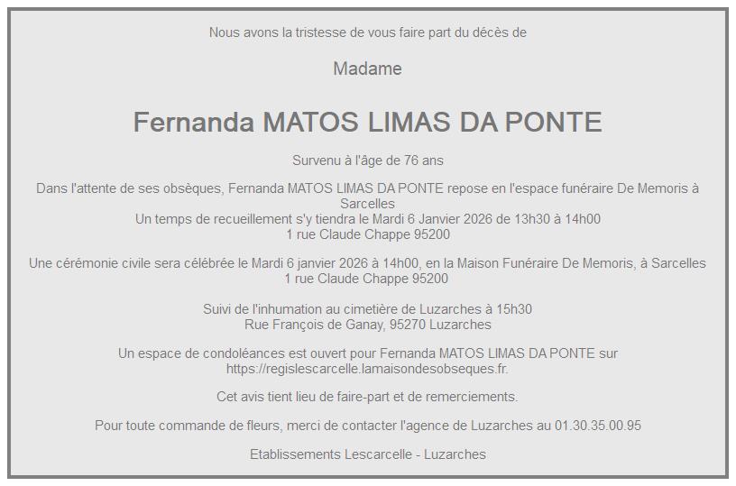 Cet espace « condoléances » est dédié à la mémoire de Madame Fernanda PETIT née MATOS LIMAS DA PONTE.