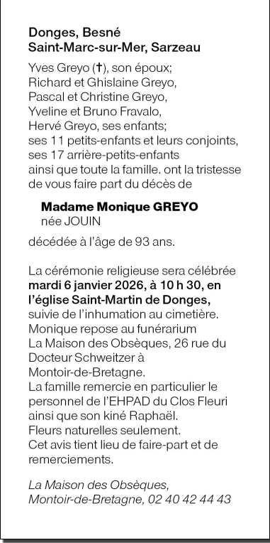 Cet espace « condoléances » est dédié à la mémoire de Madame Monique GREYO née JOUIN.