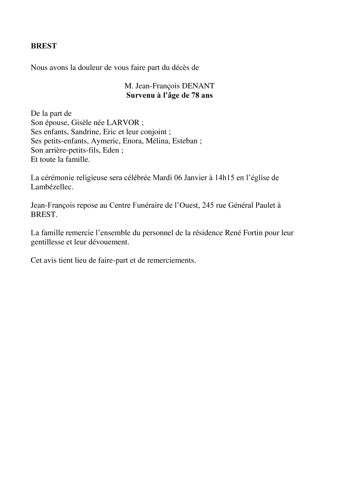 Cet espace « condoléances » est dédié à la mémoire de Monsieur Jean-François DENANT.