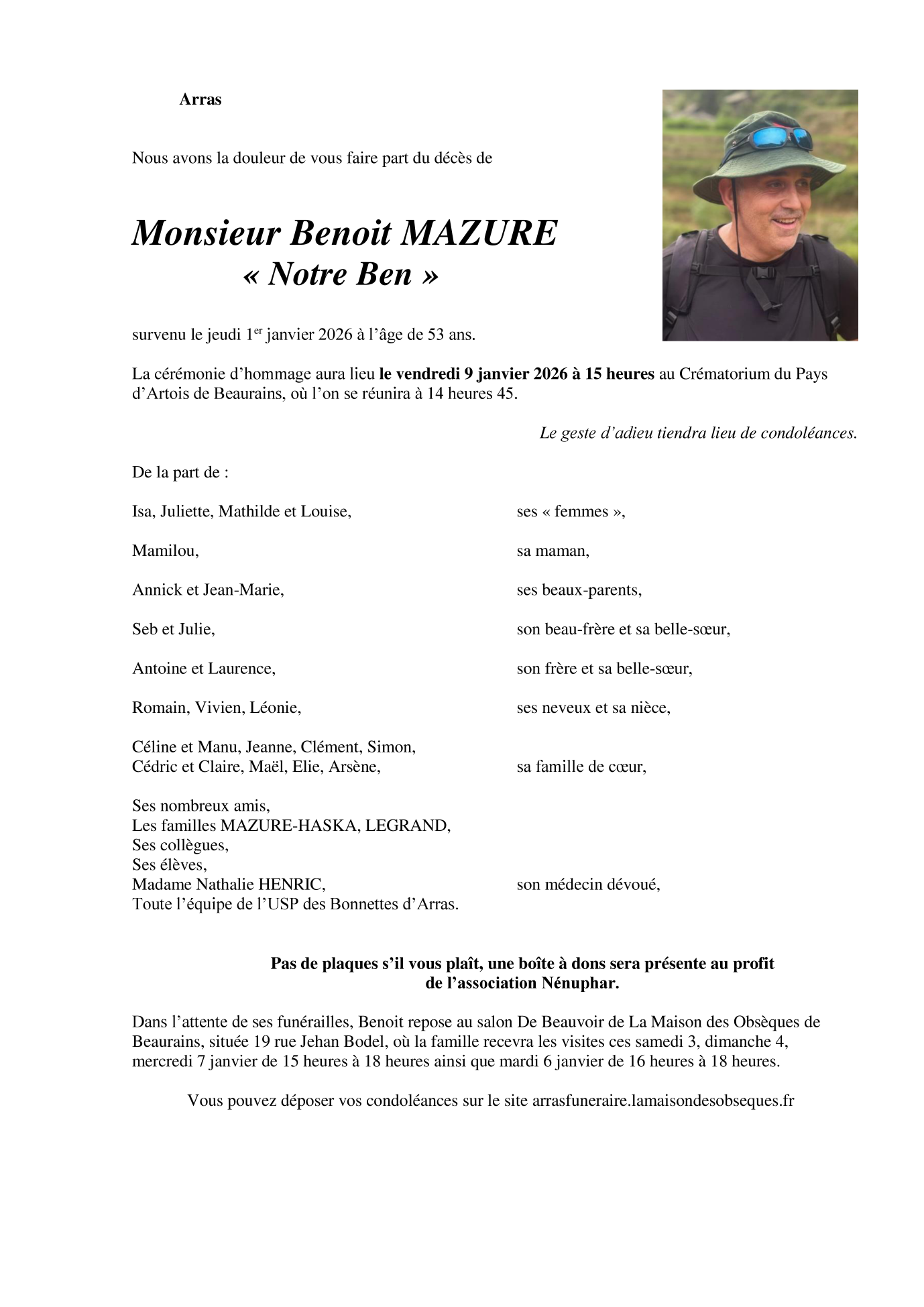 Cet espace « condoléances » est dédié à la mémoire de Monsieur Benoit MAZURE.