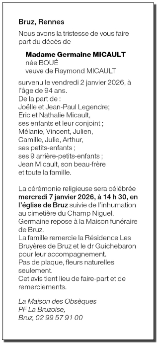 Cet espace « condoléances » est dédié à la mémoire de Madame Germaine MICAULT née BOUÉ.