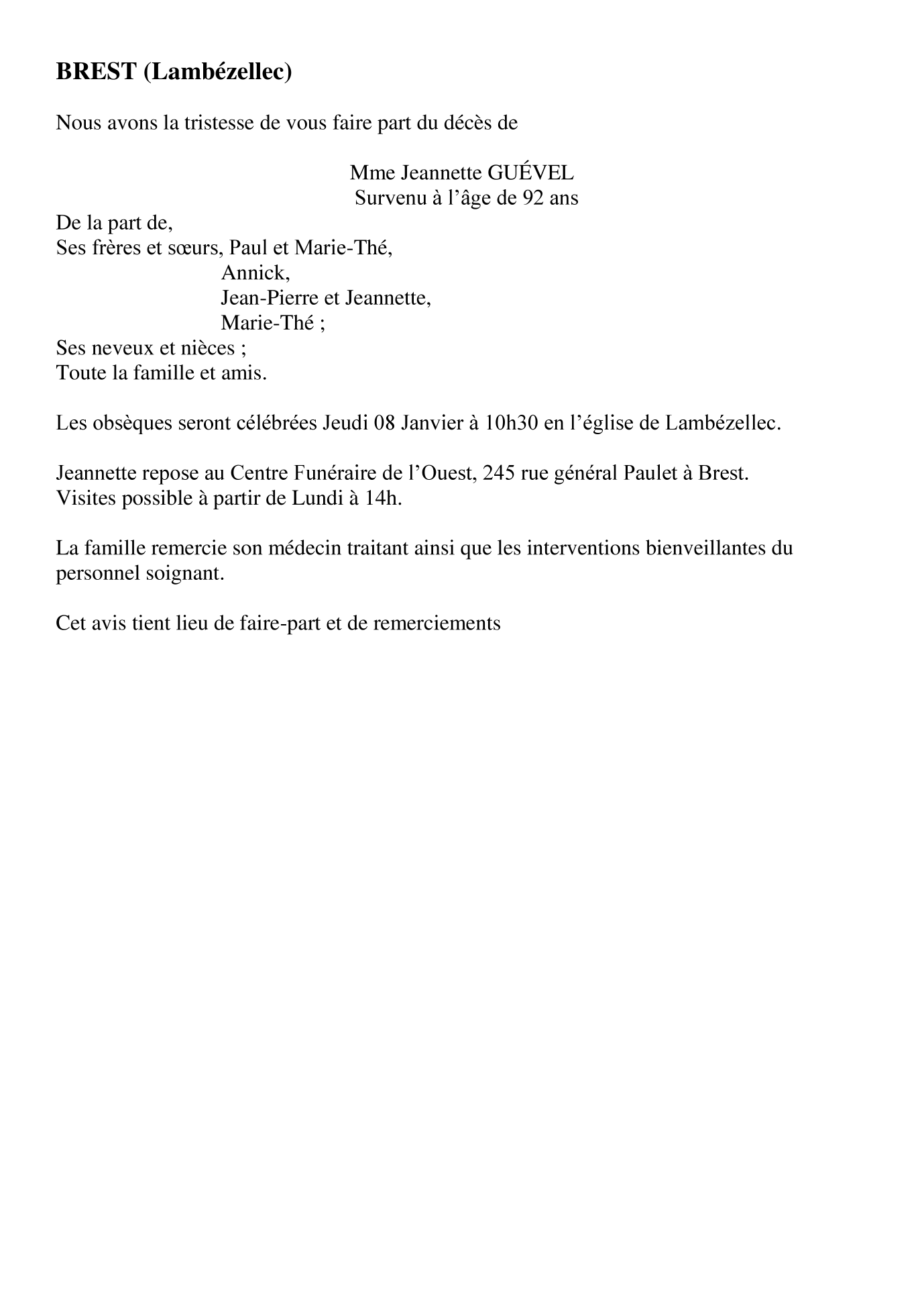 Cet espace « condoléances » est dédié à la mémoire de Madame Jeanne GUÉVEL.
