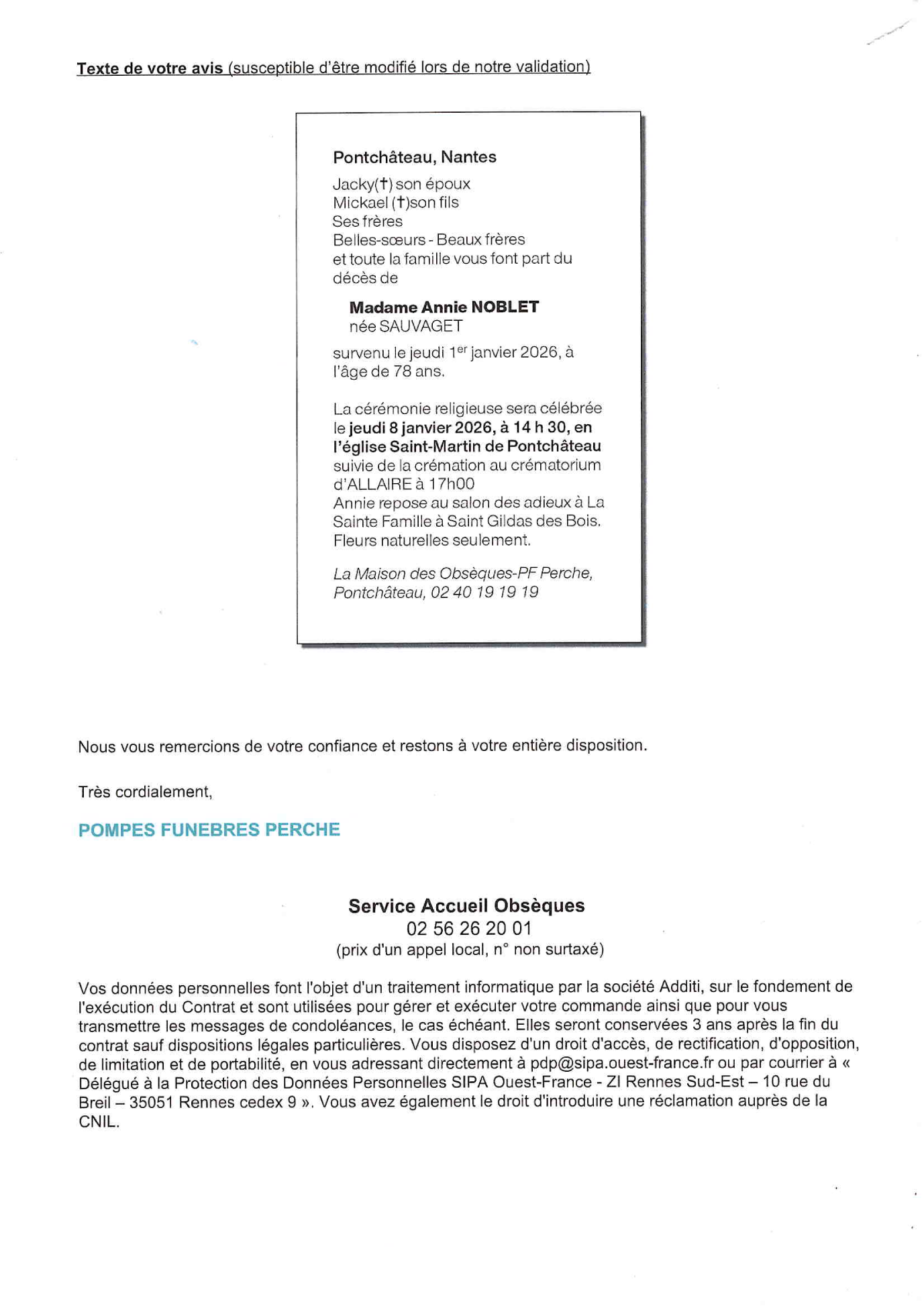 Cet espace « condoléances » est dédié à la mémoire de Madame Annie née SAUVAGET.