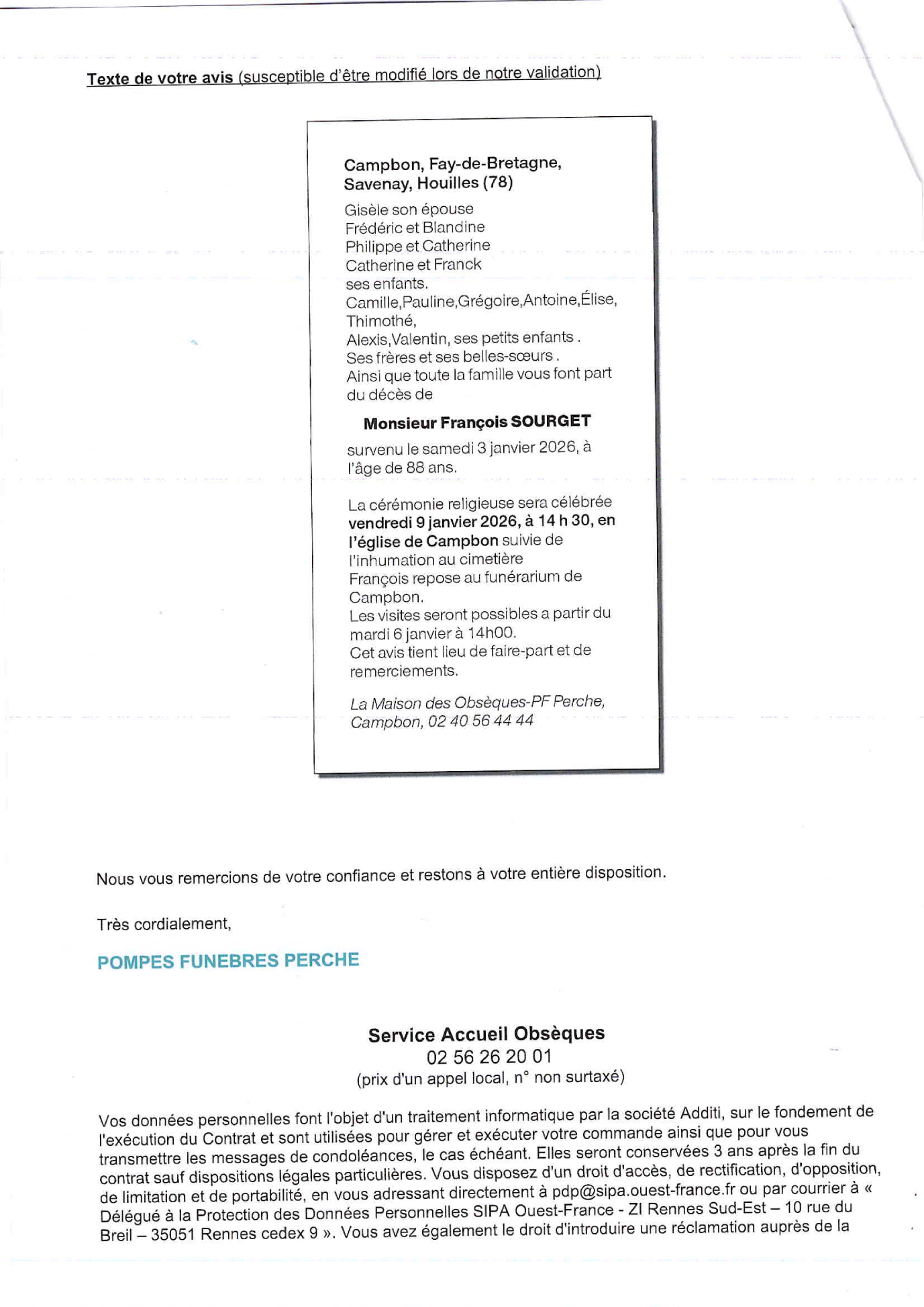 N’hésitez pas à renseigner cette page à vos connaissances. Ceux qui sont loin ou qui n’ont pas la possibilité de se joindre à la cérémonie trouveront ici une façon simple de montrer leurs sentiments à la famille dans ce moment difficile.
