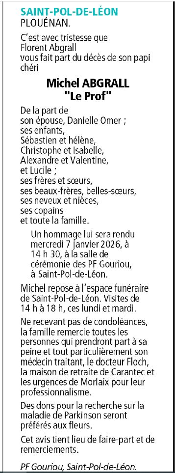 Cet espace « condoléances » est dédié à la mémoire de Monsieur Michel ABGRALL.