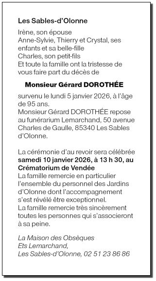 Décédé à Les Sables d'Olonne (85340) le lundi 5 janvier 2026