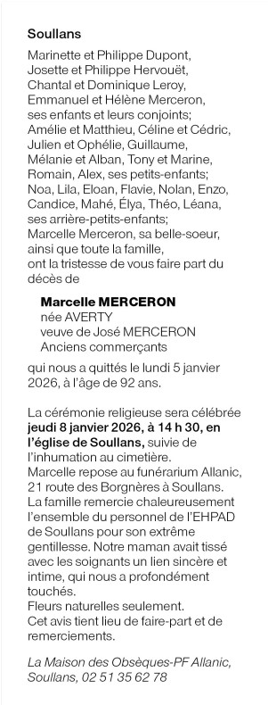 Cet espace « condoléances » est dédié à la mémoire de Madame Marcelle MERCERON née AVERTY.