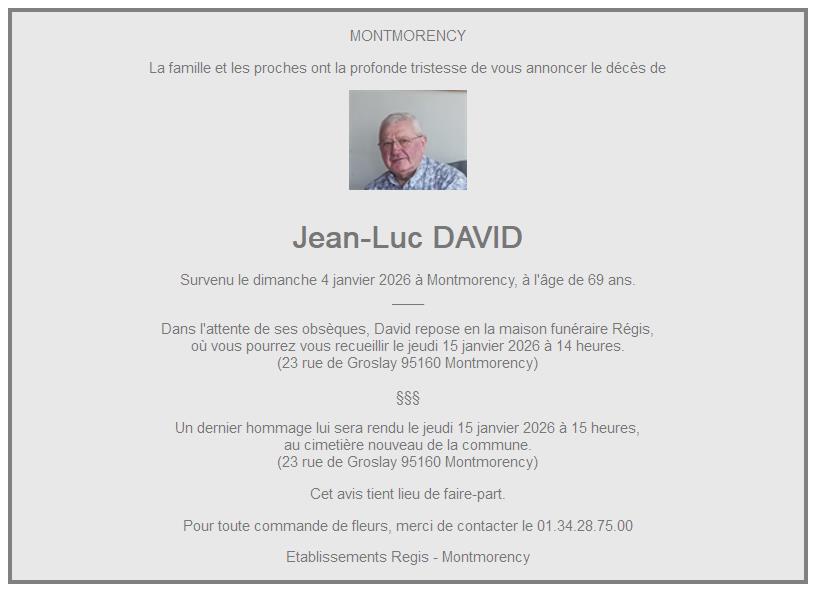 Cet espace « condoléances » est dédié à la mémoire de Monsieur Jean-Luc DAVID.