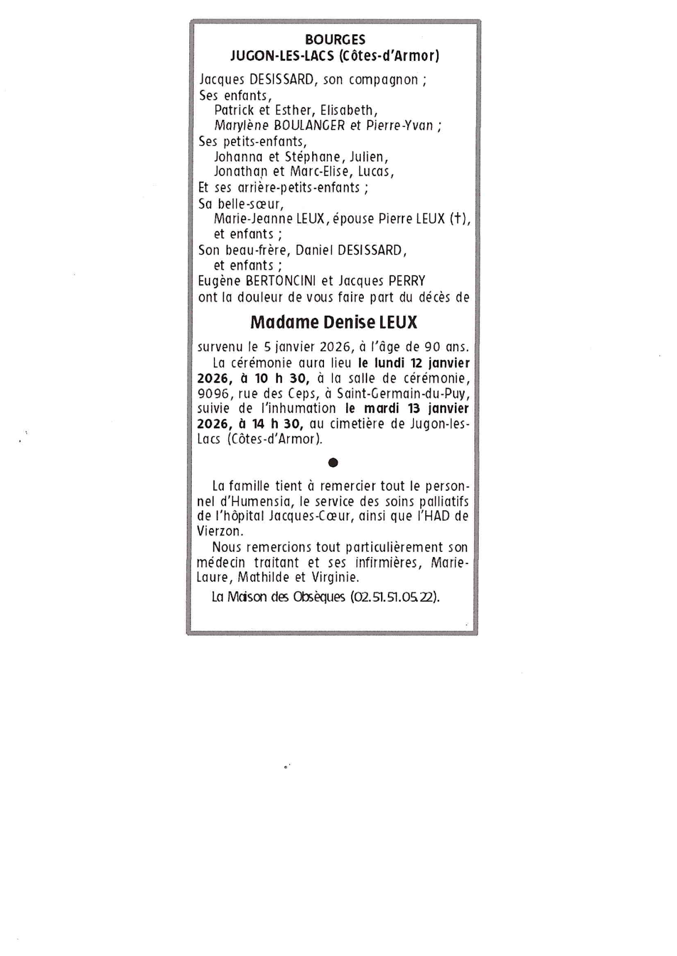 Cet espace « condoléances » est dédié à la mémoire de Madame Denise LEUX.