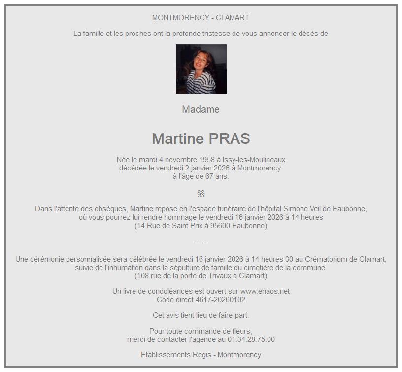 Cet espace « condoléances » est dédié à la mémoire de Madame Martine PRAS.