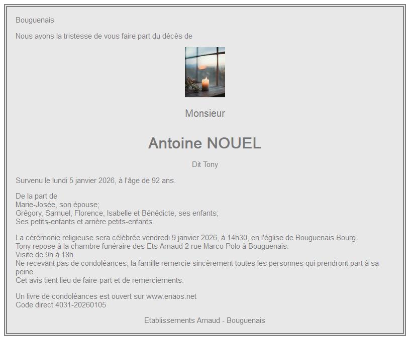 Cet espace « condoléances » est dédié à la mémoire de Monsieur Antoine NOUEL.