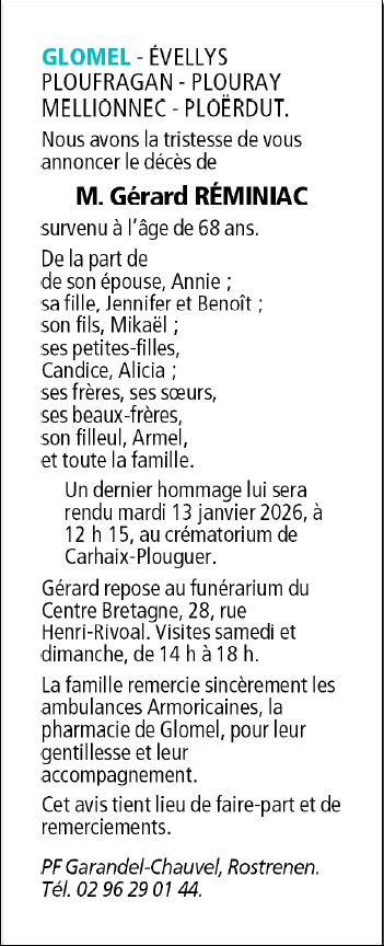 Cet espace « condoléances » est dédié à la mémoire de Monsieur Gérard RÉMINIAC.