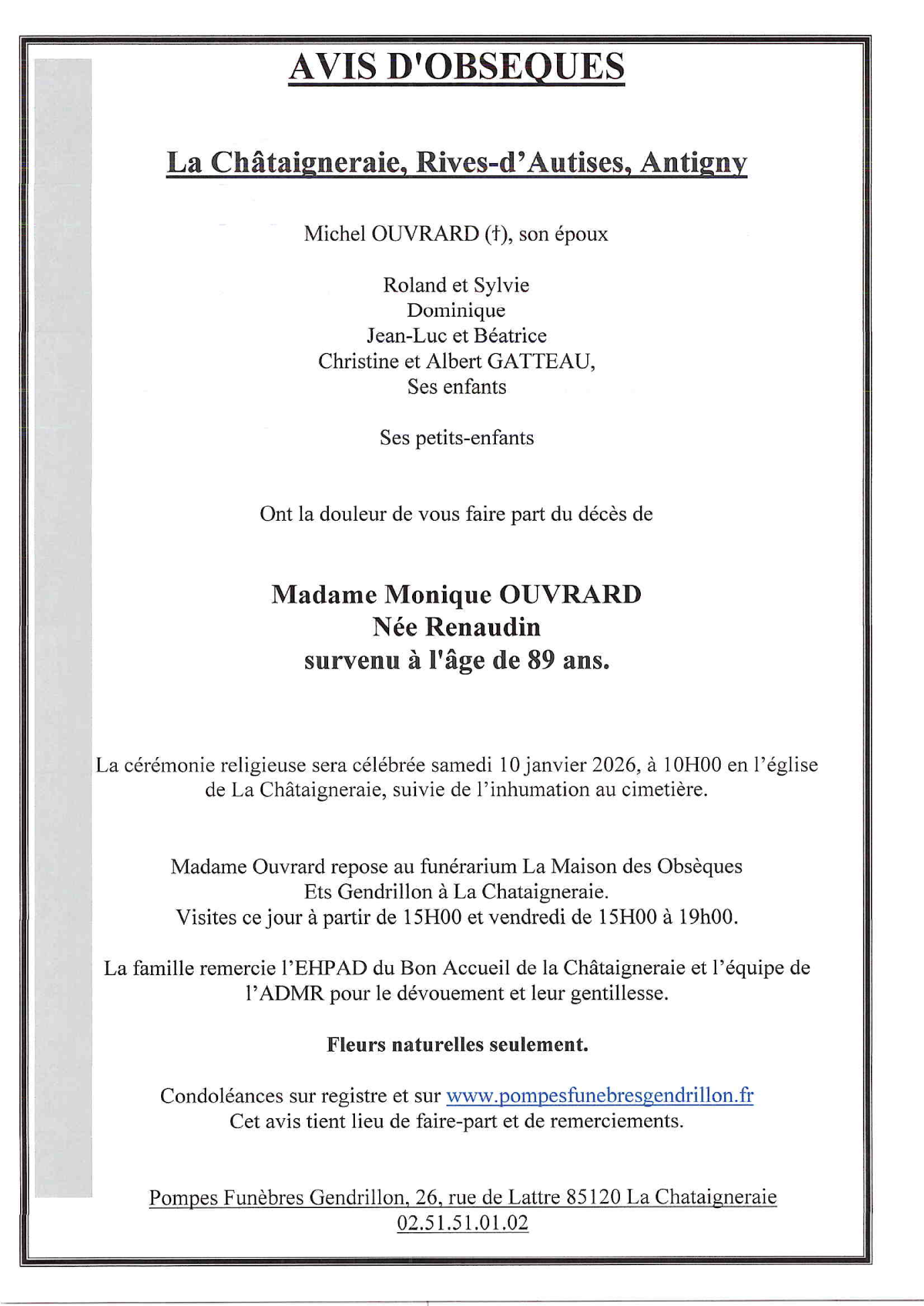 Cet espace « condoléances » est dédié à la mémoire de Madame Monique OUVRARD.