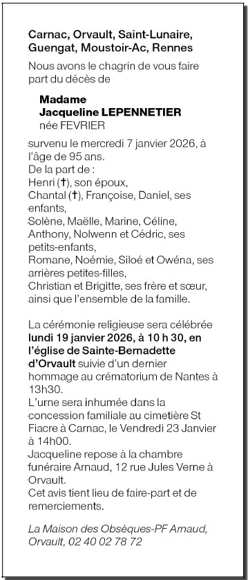 de Madame Jacqueline LEPENNETIER née FEVRIER