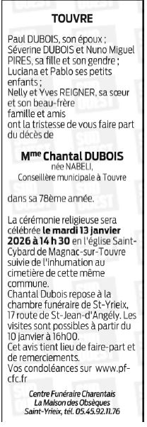 Cet espace « condoléances » est dédié à la mémoire de Madame Chantal DUBOIS née NABELI.