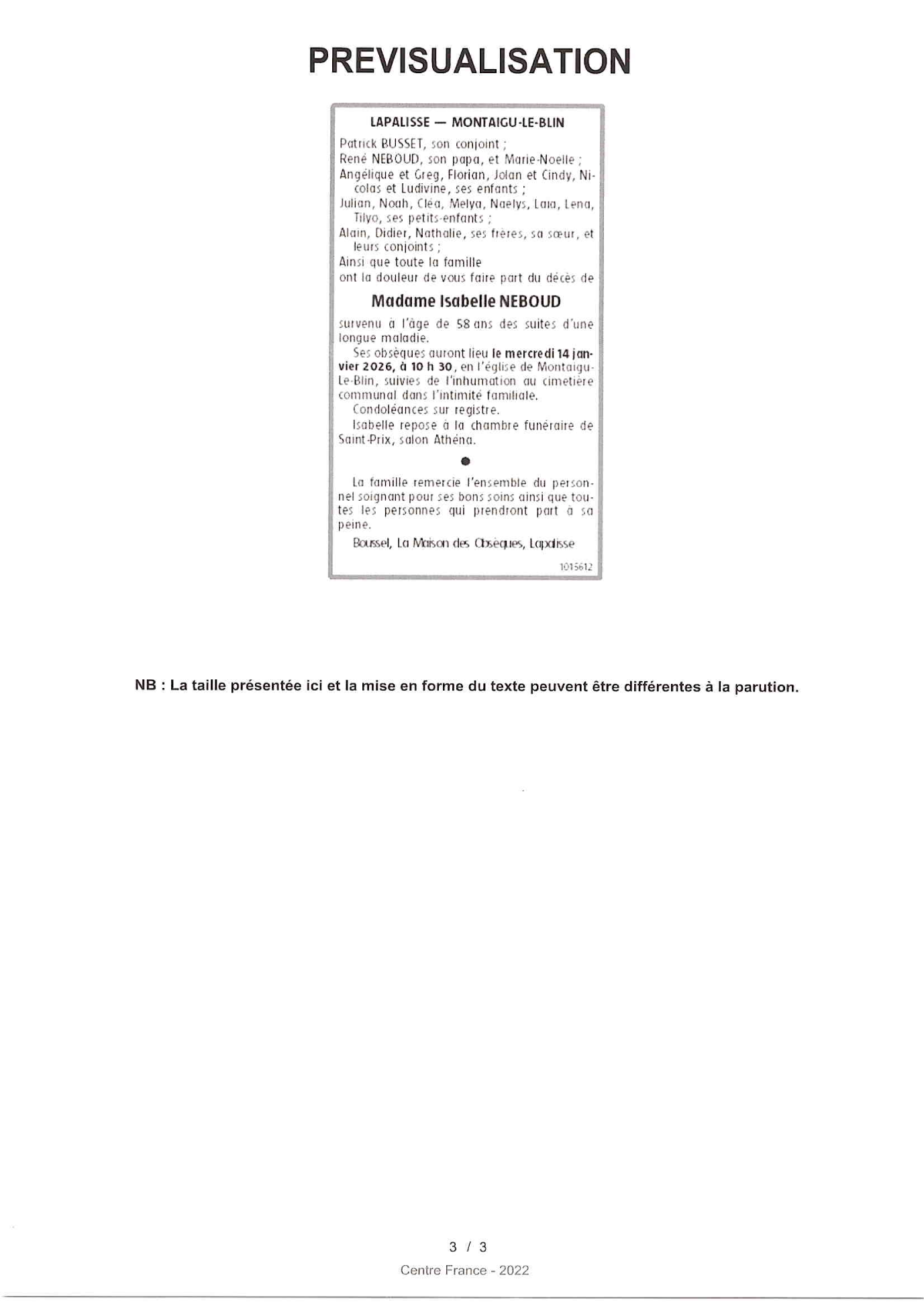 Cet espace « condoléances » est dédié à la mémoire de Madame Isabelle NEBOUD.