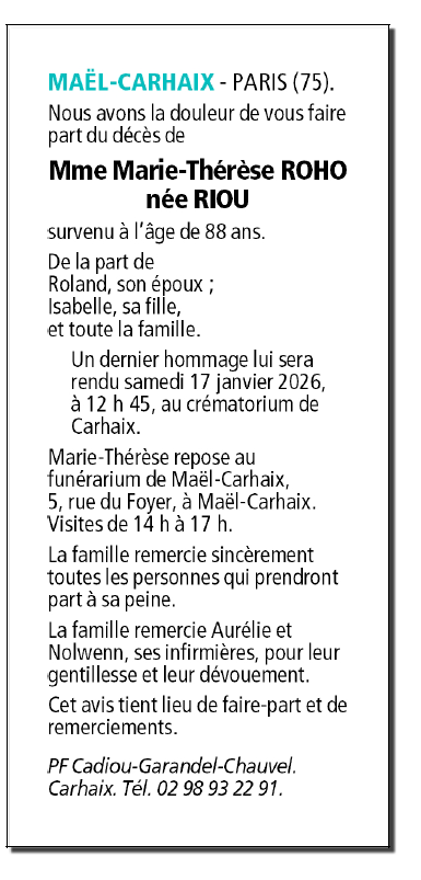 Cet espace « condoléances » est dédié à la mémoire de Madame Marie - Thérèse ROHO née RIOU.