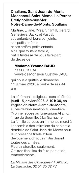 Cet espace « condoléances » est dédié à la mémoire de Madame Yvonne BAUD née BESSEAU.