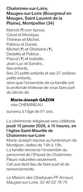 Cet espace « condoléances » est dédié à la mémoire de Madame Marie-Joseph GAZON née CHEMINEAU.