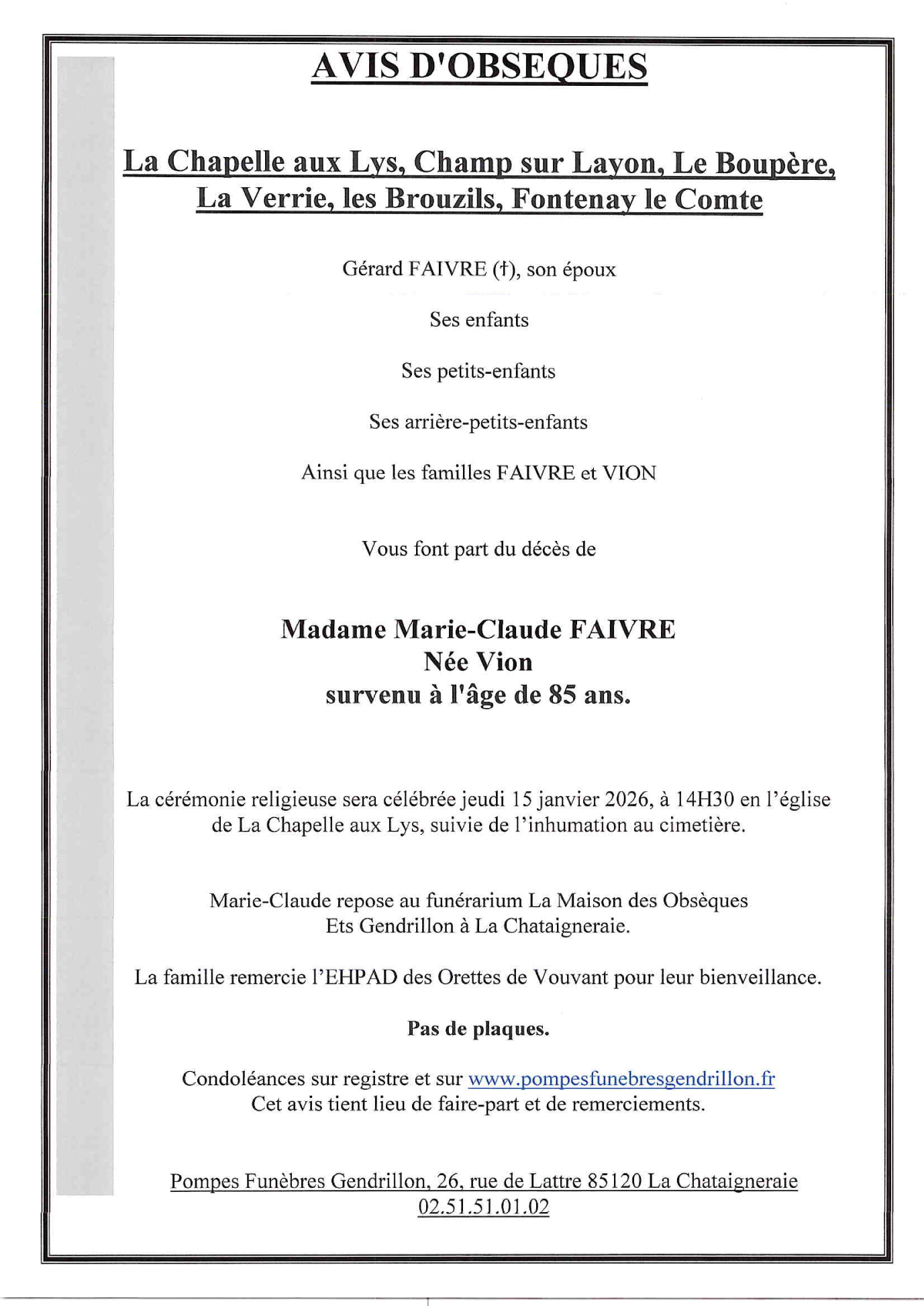 Cet espace « condoléances » est dédié à la mémoire de Madame Marie-Claude FAIVRE née VION.
