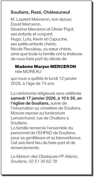 Décédée à Soullans (85300) le lundi 12 janvier 2026