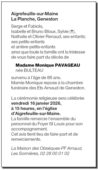 Cet espace « condoléances » est dédié à la mémoire de Madame Monique PAVAGEAU née BULTEAU.