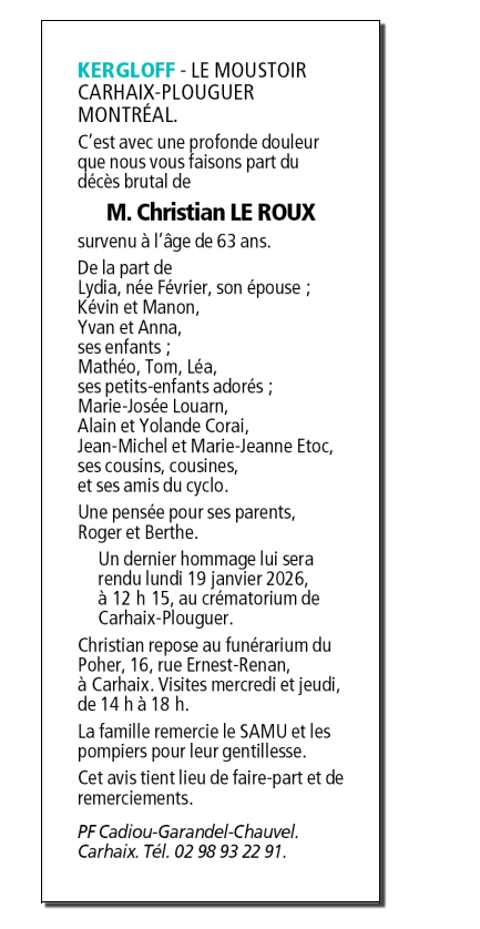 Cet espace « condoléances » est dédié à la mémoire de Monsieur Christian LE ROUX.