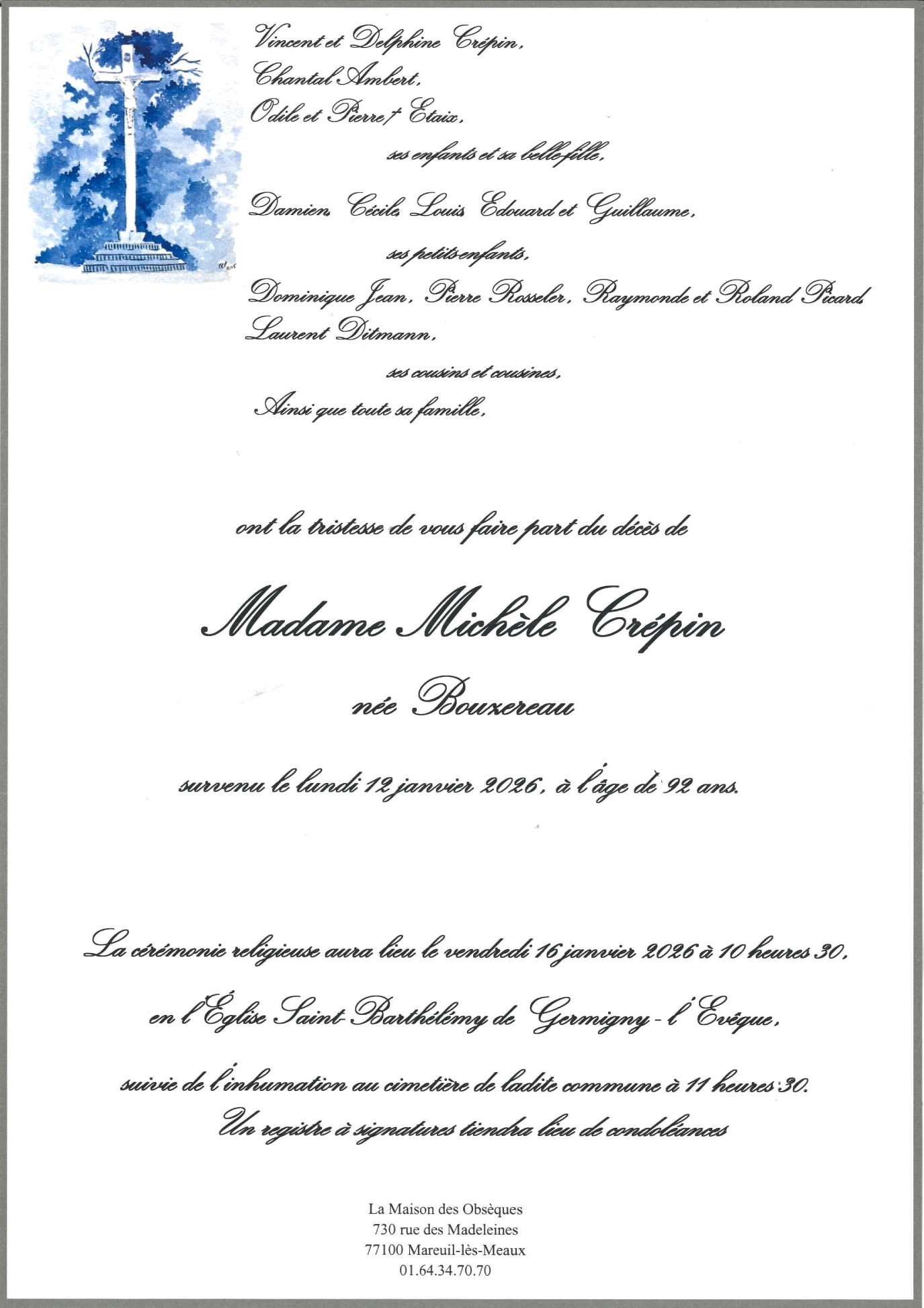 Cet espace « condoléances » est dédié à la mémoire de Madame Michèle CREPIN née BOUZEREAU.