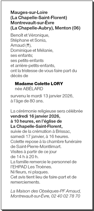 Cet espace « condoléances » est dédié à la mémoire de Madame Colette LORY née ABELARD.