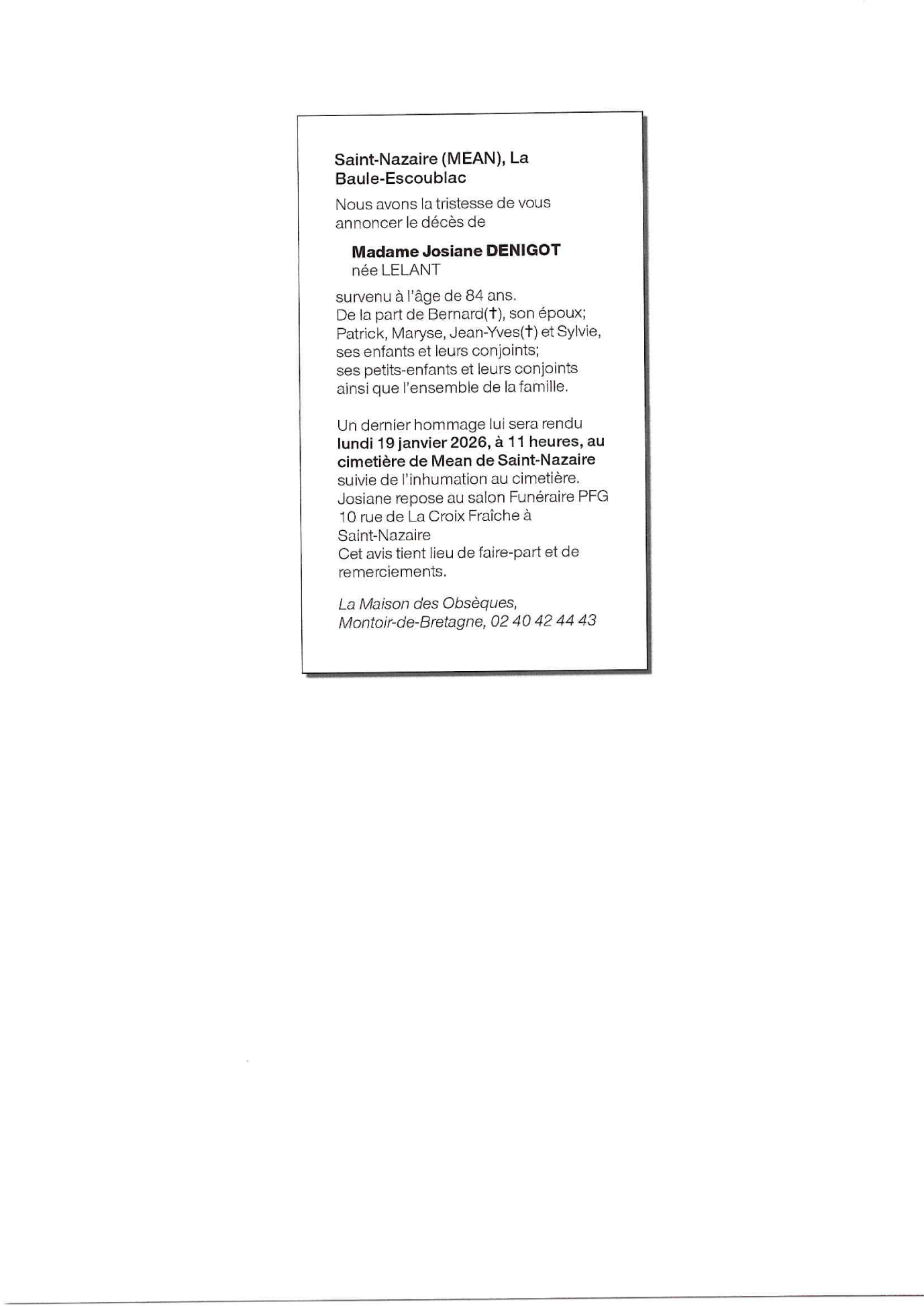 de Madame Josiane DENIGOT née LELANT