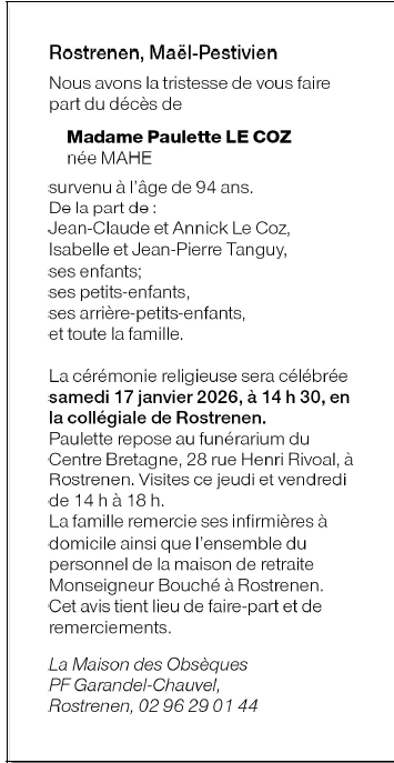 Décédée à Rostrenen (22110) le mardi 13 janvier 2026